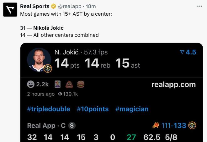 这样一来,约基奇开季至今前两场比赛连续拿下三双,首秀约基奇也有19分13篮板10助攻入账。凭借这样的表现,约基奇先是在首秀连续第三年揭幕战拿下三双,生涯第四次首秀拿下三双追平大O。本场连续拿下三双后,又将生涯拿下15+助攻场次提升至31场,断层高居NBA历史中锋第一,而其他中锋一共仅在14场比赛中交出过15+助攻表现。