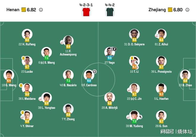 河南队首发【4-3-3】门将:18-王国明后卫:4-叶力江【46分,2-刘易鑫】、23-马亚、36-迈达纳、22-黄锐烽中场:6-王上源、38-卢永涛【73分,20-何超】、7-钟义浩前锋:40-纳萨里奥、9-卡多索、11-阿奇姆彭【85分,3-周缘德】替补:33-史成龙、16-杨阔、27-牛梓屹、13-阿卜杜肉苏力、15-刘斌、17-何小珂、19-杨意林、10-黄紫昌、30-刘鑫瑜浙江队首发【4-4-2】门将:33-赵博后卫:5-刘浩帆、26-孙国文、36-卢卡斯、81-张瑷晖【86分,16-童磊】中场:10-李提香、22-程进【80分,29-张佳祺】、31-奥乌苏、39-王钰栋【80分,11-弗兰克】前锋:20-米特里策、27-卡列洛替补:1-董春雨、32-霍深坪、2-梁诺恒、3-王瑒、6-姚均晟、7-陶强龙、8-钱杰给、13-麻皓齐、24-汪士钦