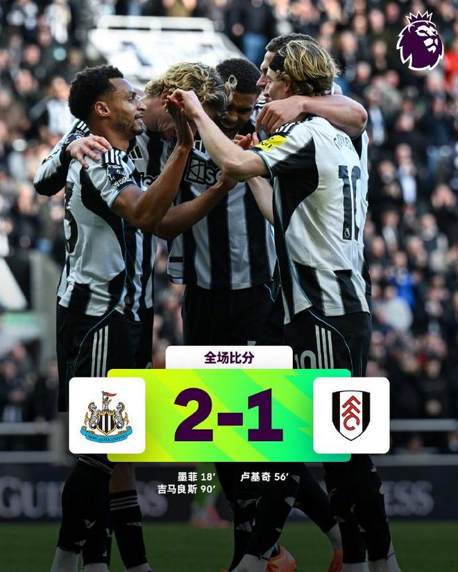 本场比赛,纽卡斯尔主场面对富勒姆,开场第18分钟依靠雅各布-墨菲的低射破门,取得1-0的领先优势。直到下半场第56分钟,卢基奇门前头球补射破门,帮助富勒姆1-1扳平比分。第90分钟,吉马良斯补射破门,帮助纽卡斯尔2-1完成绝杀。利物浦2-3布伦特福德