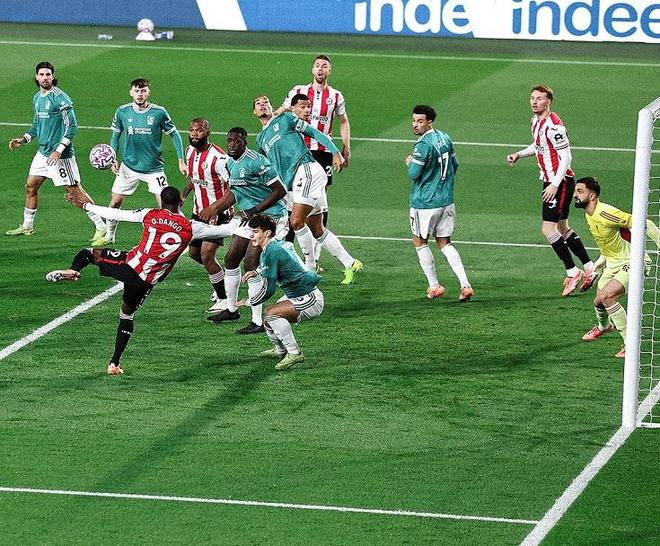 比赛刚刚开打5分钟,小蜜蜂就取得了领先,大力边线球掷出后,瓦拉塔倒钩破门,将比分改写为了1-0,第19分钟维尔茨获得了禁区内补射的机会,可惜他的打门擦着立柱出了底线,第45分钟小蜜蜂获得反击机会,沙德单刀破门,将领先的优势扩大到了2球。半场比赛结束之前,利物浦右路下底传中,后点包抄的科尔克兹抢点破门,将比分追到了1-2,不过第60分钟范迪克禁区线上犯规送给了对手一粒点球,蒂亚戈主罚命中,帮助小蜜蜂3-1稳住了阵脚,在布伦特福德第二粒进球前,加克波突入禁区被放倒,主裁判没有任何表示,这也是赛后范迪克炮轰裁判双标的原因。