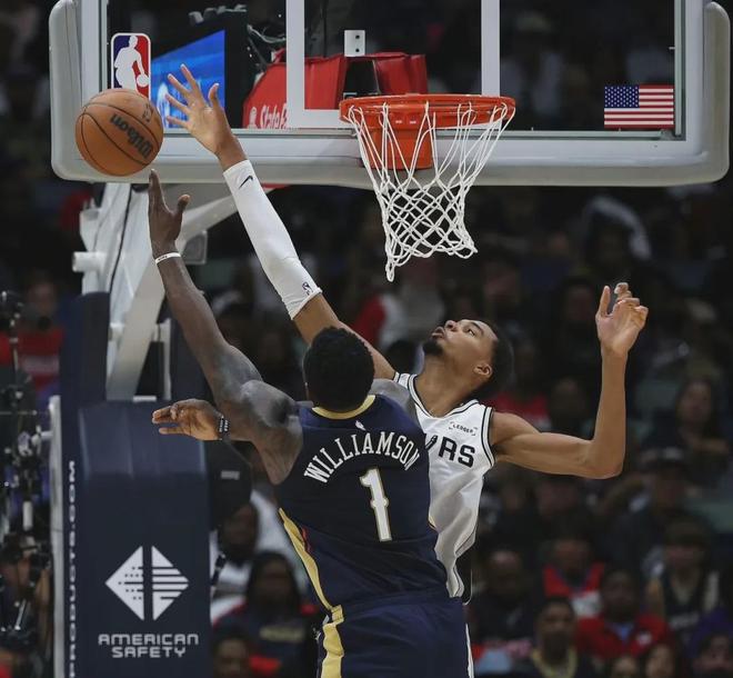揭幕战vs独行侠,40分15篮板3盖帽,投篮21中15。次战vs鹈鹕,29分11篮板9盖帽,如果不是犯满,大概率包含盖帽的三双了。今天打篮网,31分14篮板6盖帽4助攻3抢断。在新赛季的前三场比赛中,文班亚马合计得到100分40篮板8助攻5抢断18盖帽,场均33.3分13.3篮板2.3助攻1.7抢断6盖帽,投篮命中率56.9%。据统计,开赛季前三战合计得到至少100分15帽,文班亚马是NBA历史首人。前三场比赛过后,只有两支球队的总盖帽数超过了文班亚马个人的盖帽数,活塞和灰熊。然后,马刺三连胜,暂居西部第一。很难想象,一名球员,他有着2米26,姚明一样的身高,但他有2米44的臂展,进攻端能突能投,他可以像后卫一样变向,可以中远投...浓眉和弗拉格,两代美国之子,再加上莱夫利,天赋已经是联盟顶级了,但在文班这种史诗级天赋前,被打成了“文玩”。