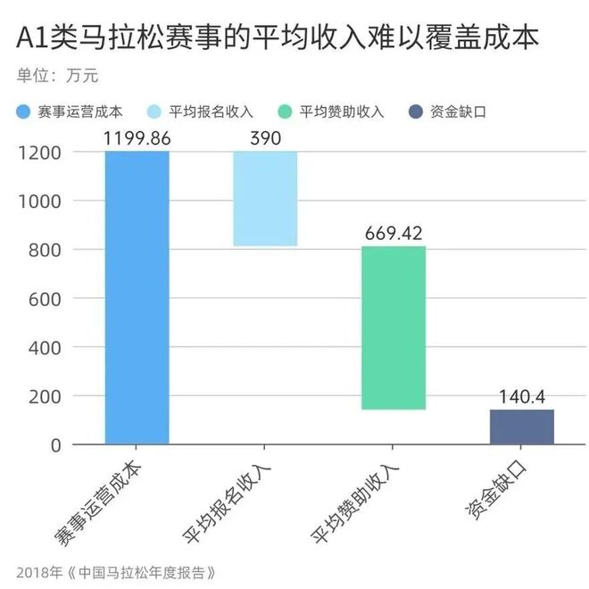 2018年《中国马拉松年度报告》的数据显示,一场3万人的A1赛事,平均支出为1199.86万元,报名收入为390万元,赞助收入为669.42万元,算下来平均超过100万元缺口,只能地方政府硬着头皮上了。
