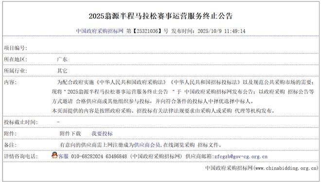 直接原因是,据马拉松圈内人士分析,10月9日的时候,中国政府采购网发布了一则《2025翁源半程马拉松赛事运营服务终止公告》通知,提及了“新规”:“由于马拉松政策新规,县区级及以下的C类马拉松赛事将全面停办,故终止本项目当前招标采购活动。”