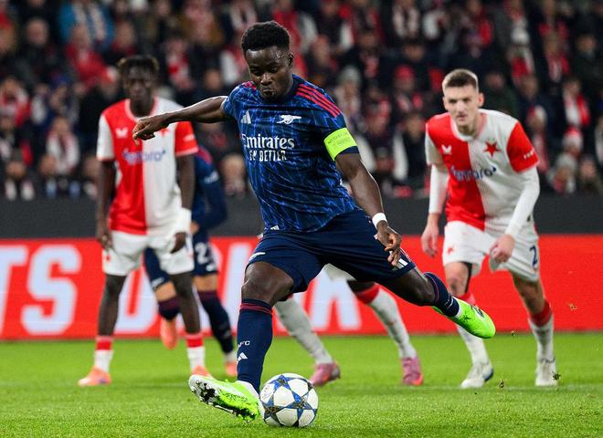 比赛正式开打之后,阿森纳就反客为主,在场上压着布拉格斯拉维亚猛攻,第2分钟加布里埃尔大禁区前沿的远射,擦着立柱出了底线,萨卡在第20分钟突施冷箭完成了一脚远射,被主队门将飞身扑出。狂攻不止的阿森纳,在第32分钟造成了对方球员禁区内手球,主裁判回看VAR后,给了枪手一粒点球,萨卡主罚命中,帮助球队取得了1-0的领先,凭借此球,萨卡也成为了欧冠改制后,阿森纳队史首位连续四个欧冠客场取得进球的球员。
