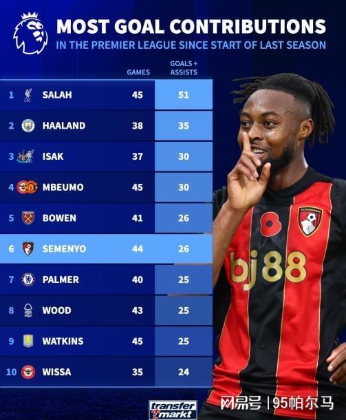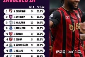 “进球和助攻上双是我的新目标之一。”这是塞梅尼奥新赛季开打之前的愿望,事实上他在本赛季12场各项赛事中已经制造了9粒进球,个人参与进球数占球队总进球数的81.8%,这个权重位居英超第一。最高光的瞬间莫过于在安菲尔德遭遇种族歧视之后,上演了梅开二度的好戏,即使伯恩茅斯吃了败仗,塞梅尼奥虽败犹荣,值得一提的是,他也是自2022年9月以来,第一位在英超客场对利物浦完成双响的球员。
