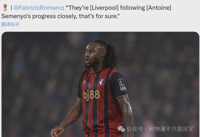 今天简单聊聊近期利物浦与塞梅尼奥(AntoineSemenyo)的绯闻。塞梅尼奥目前25岁(明年1月将26岁),身高1米85,与伯恩茅斯合同2030年到期。本赛季英超11场全部打满90分钟,6球3助攻,但最近4轮0进球0助攻。关于利物浦与塞梅尼奥的传闻,最近相对来说最靠谱的是名记罗马诺和天空体育,但他们报道中的关键词仅仅是“关注”。罗马诺表示利物浦当然会“密切关注”塞梅尼奥,而天空体育称利物浦、曼城和热刺在冬窗到来前“关注”塞梅尼奥。