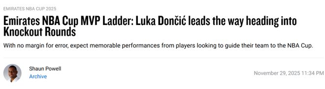 NBA杯MVP排名:东契奇领跑亚历山大第二里夫斯第四詹姆斯未上榜