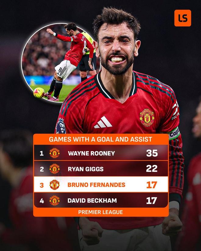 英超第16轮,曼联主场4-4战平伯恩茅斯,布鲁诺-费尔南德斯贡献一球一助,至此,布鲁诺-费尔南德斯曼联生涯已有17次英超单场传射建功,队史仅次于鲁尼和吉格斯。