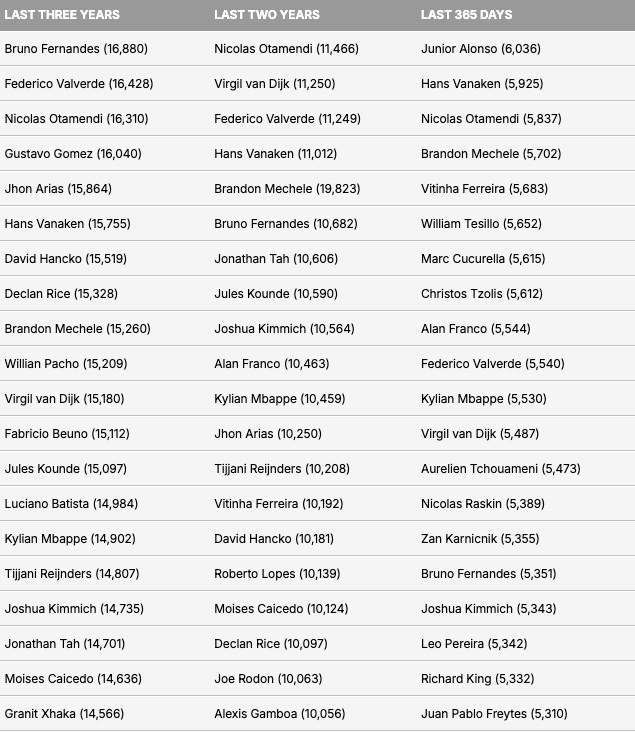 根据CIES周三发布的统计数据,在过去三年里,没有任何一名非门将球员的出场时间超过布鲁诺-费尔南德斯。这位31岁的曼联队长自2020年从葡萄牙体育加盟以来,一直是老特拉福德的绝对主力,并在出勤稳定性方面确立了自己作为英超最可靠中场之一的地位。在鲁本-阿莫林执教时期,以及此前滕哈格执教阶段,费尔南德斯几乎场场打满90分钟。过去三年中,他几乎没有缺席过曼联的比赛,并且成功避开了重大伤病。根据足球天文台发布的最新一期周报,费尔南德斯在俱乐部和国家队层面共出战192场正式比赛,累计出场时间达到16880分钟,在全球范围内排名第一,该统计不包含门将位置球员。报告显示,皇家马德里和乌拉圭中场巴尔韦德以16428分钟排名第二,尽管在这段时间内他的出场场次比费尔南德斯多出7场。效力于本菲卡的阿根廷老将奥塔门迪位列第三,这位37岁的后卫在187场比赛中累计出场16310分钟。奥塔门迪曾在2015年至2020年期间效力于曼城。排名第四和第五的分别是帕尔梅拉斯后卫古斯塔沃-戈麦斯和狼队中场阿里亚斯,过去三年的出场时间分别为16040分钟和15864分钟。阿里亚斯于夏天从弗鲁米嫩塞加盟狼队。
