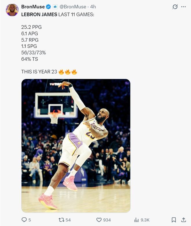过去的11场比赛,詹姆斯场均25.2分6.1助攻5.7篮板1.1抢断,命中率56%,三分命中率33%,真实命中率64%。