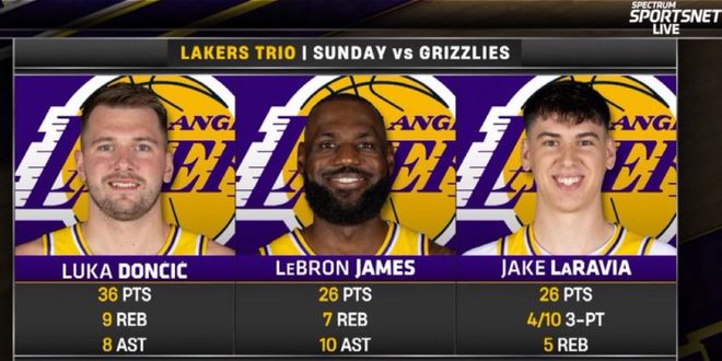 湖人逆转16分击败灰熊,湖人队三人拿到25+(东契奇36分、詹姆斯26分、拉拉维亚26分),此役后湖人已经重返西部第三,勒布朗-詹姆斯打出他41岁后首个25+10+5,这位41岁的老将又创造了历史性的时刻。
